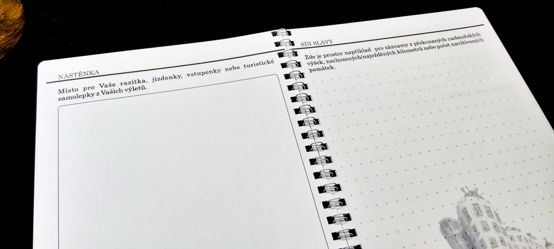 V úvodu se krátce seznámíte s konkrétním územím. Na dalších stránkách si můžete zapisovat Vaše inspirace a zakreslit, či nalepit trasy Vaší cesty. V další fázi si již výlet naplánujete. Můžete si vymyslet různé výzvy, které pak v průběhu cest budete plnit a budete mít o zábavu postaráno. Další strana je věnována seznamu věcí, co nezapomenout a je zde i prostor pro aktuální předpověď počasí. Největší část je samozřejmě věnována výletům. V závěru je prostor, kam si můžete vlepovat jízdenky, vstupenky a podobné suvenýry. Je zde také síň slávy, pro největší výkony či úspěchy během cest. Pak už Vám nezbude nic jiného než zhodnotit a sepsat nejhezčí zážitky. Na deskách naleznete i mapu oblasti.