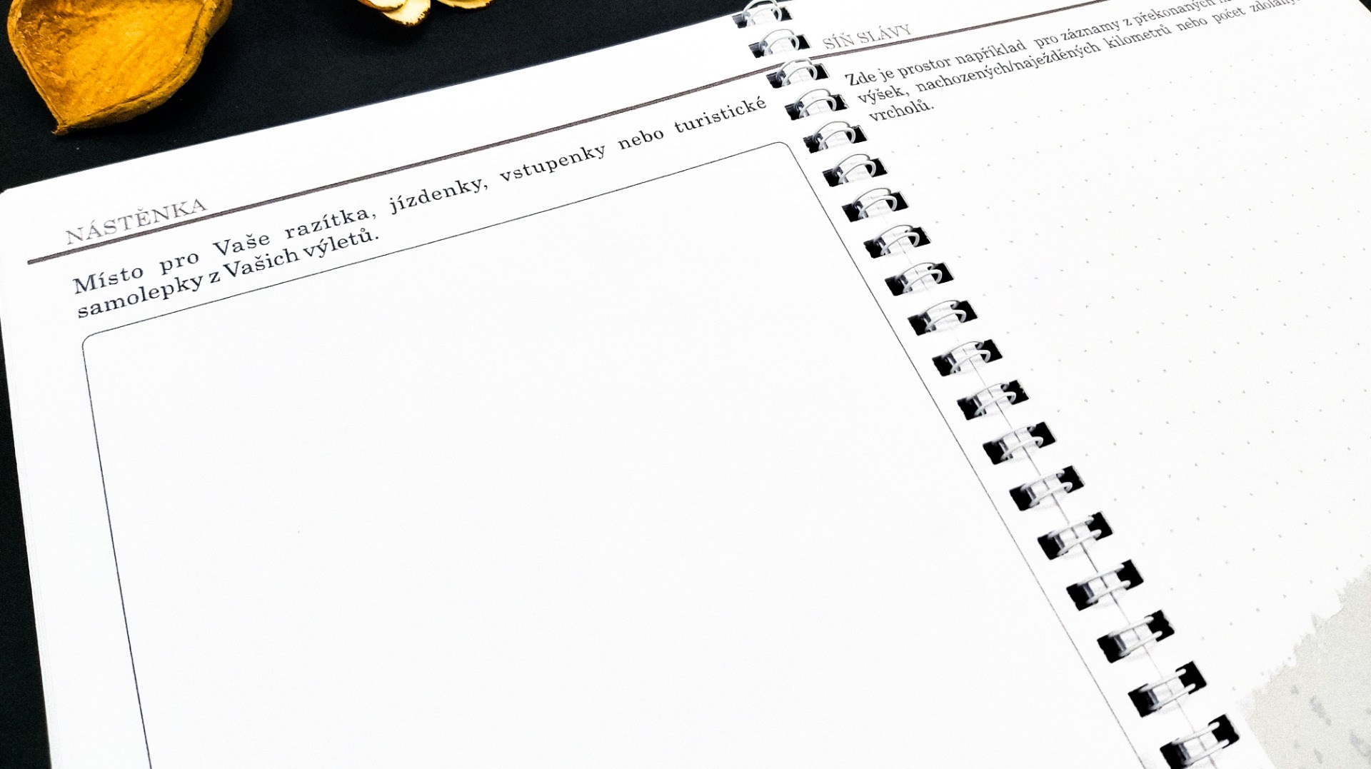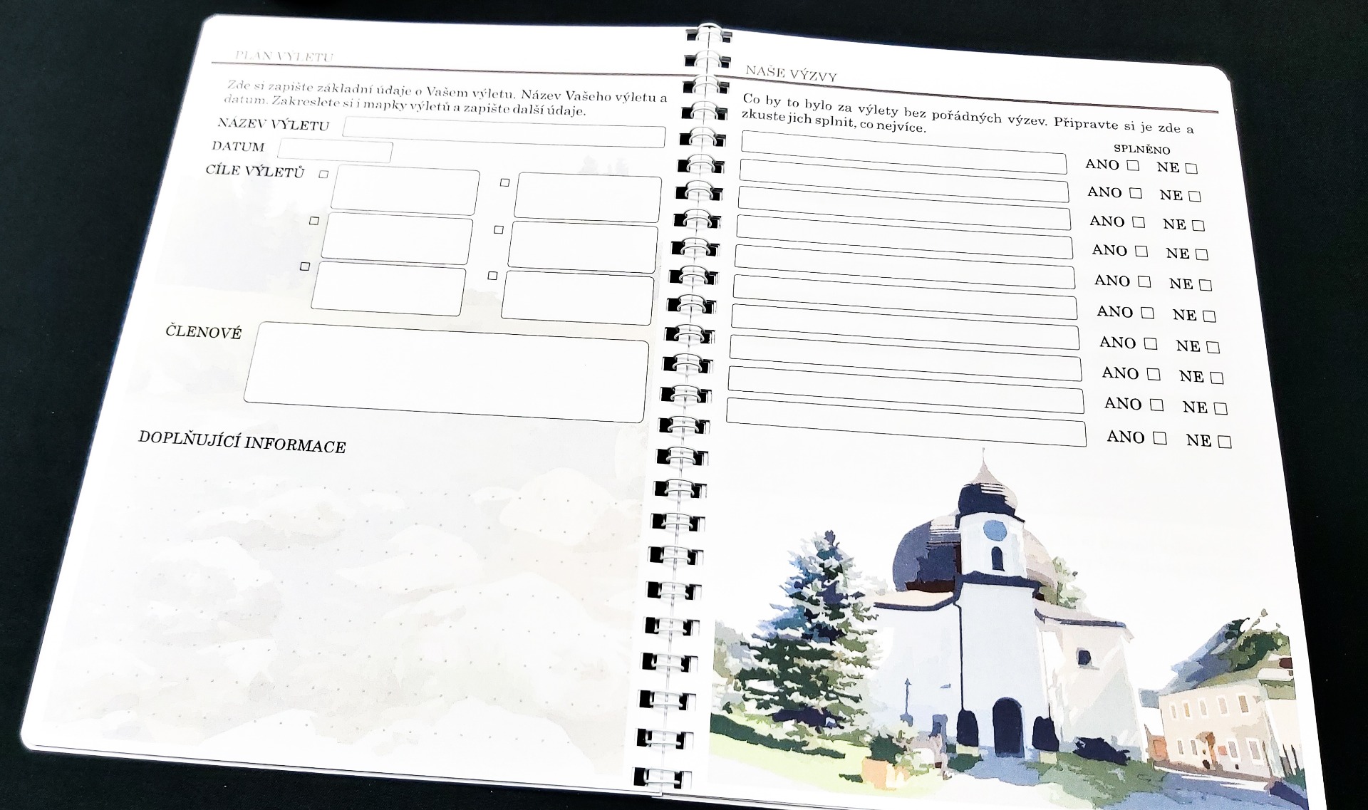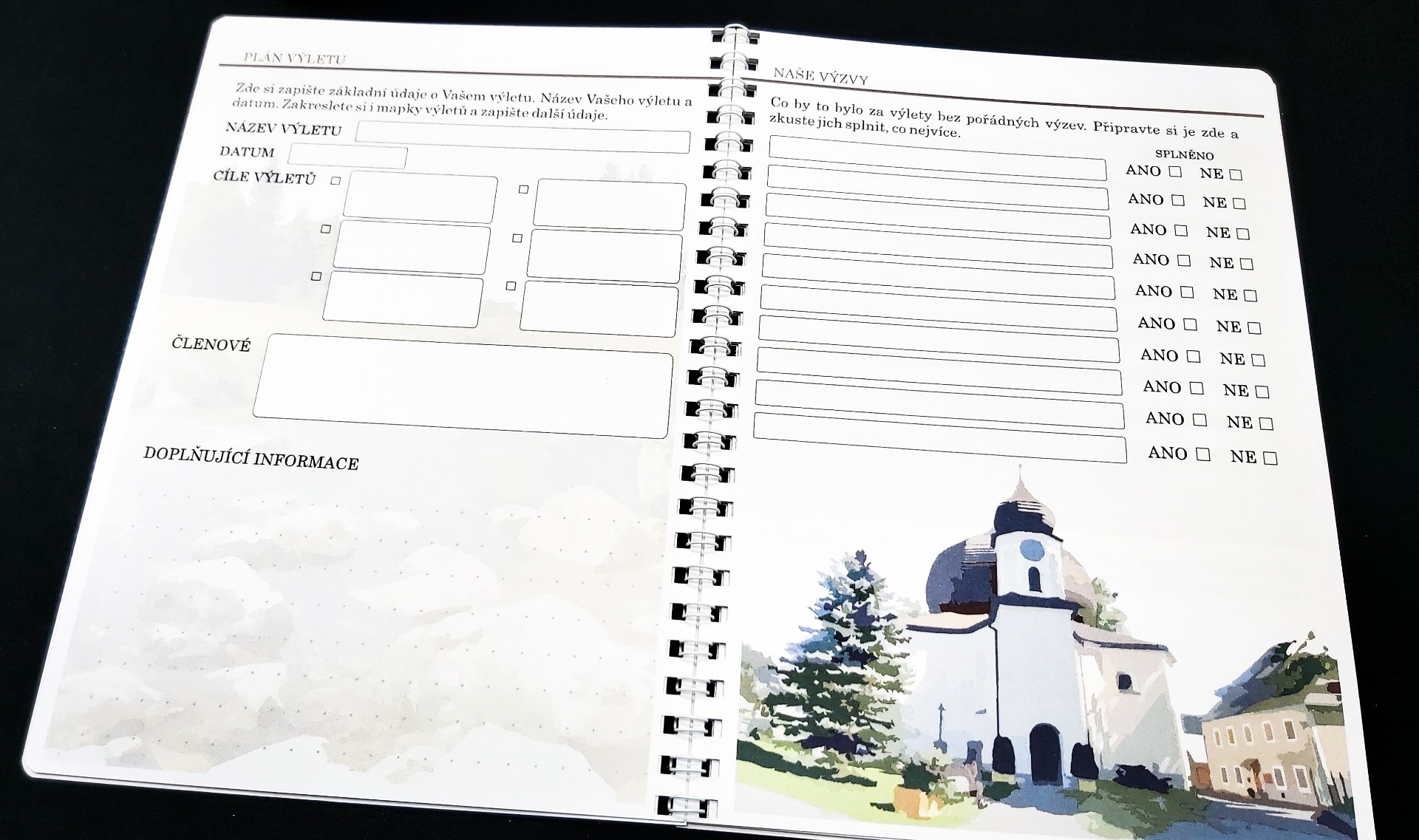 V úvodu se krátce seznámíte s konkrétním územím. Na dalších stránkách si můžete zapisovat Vaše inspirace a zakreslit, či nalepit trasy Vaší cesty. V další fázi si již výlet naplánujete. Můžete si vymyslet různé výzvy, které pak v průběhu cest budete plnit a budete mít o zábavu postaráno. Další strana je věnována seznamu věcí, co nezapomenout a je zde i prostor pro aktuální předpověď počasí. Největší část je samozřejmě věnována výletům. V závěru je prostor, kam si můžete vlepovat jízdenky, vstupenky a podobné suvenýry. Je zde také síň slávy, pro největší výkony či úspěchy během cest. Pak už Vám nezbude nic jiného než zhodnotit a sepsat nejhezčí zážitky. Na deskách naleznete i mapu oblasti.